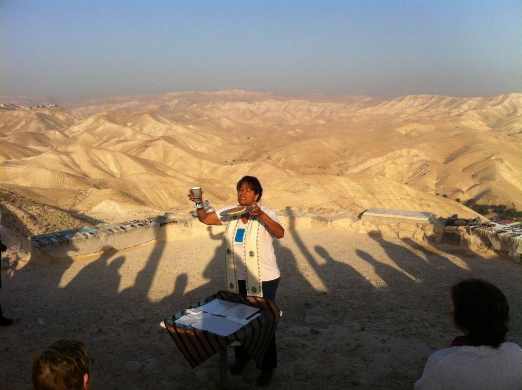 Bishop Gayle holds Eucharist in the desert in Wadi Quelt. Pete Jeffrey