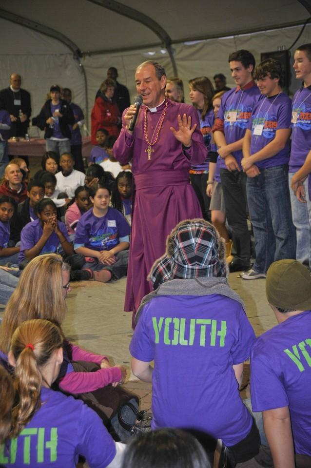 Bishop Shaw rallied youth under a tent in Copley Square during Diocesan Convention at Trinity Church in 2009. Peter Paradise