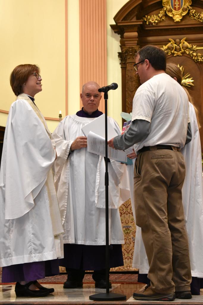 Amy McCreath presents facilities manager Jim Woodworth with a symbolic box of light bulbs so that the cathedral church may be "a light to the community and inviting house of prayer for all people." Photo: Bridget K. Wood